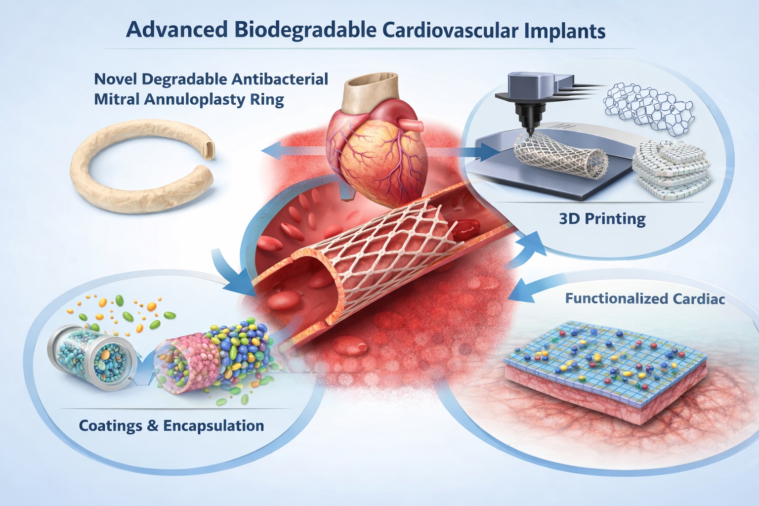 We developed a novel, fully degradable mitral annuloplasty ring featuring a rare-earth-free magnesium (Mg) core and an electrospun polycaprolactone (PCL) sleeve functionalized with silver nanoparticles, combining robust mechanical support with sustained, localized antibacterial activity. This design provides effective infection resistance while preserving the natural growth capacity of the annulus and maintaining native 3D valve dynamics. Importantly, the ring achieves implantability and hemodynamic performance comparable to established non-degradable commercial devices. Following successful validation in both small and large animal models, the project is currently in its final preclinical evaluation phase, actively advancing toward the next stage of clinical translation.